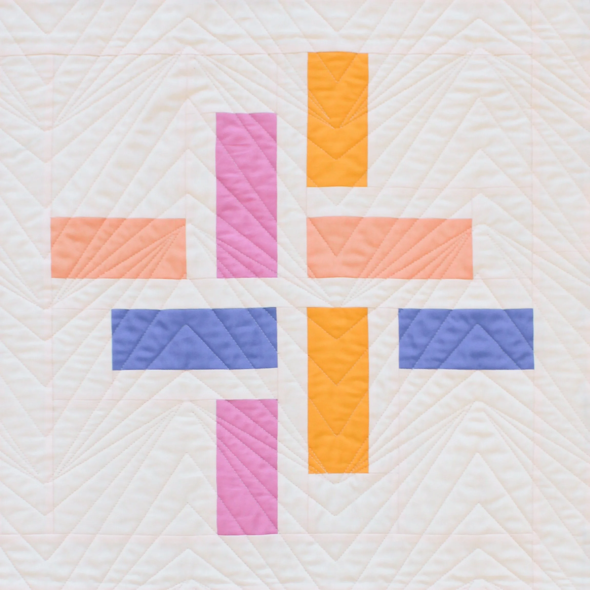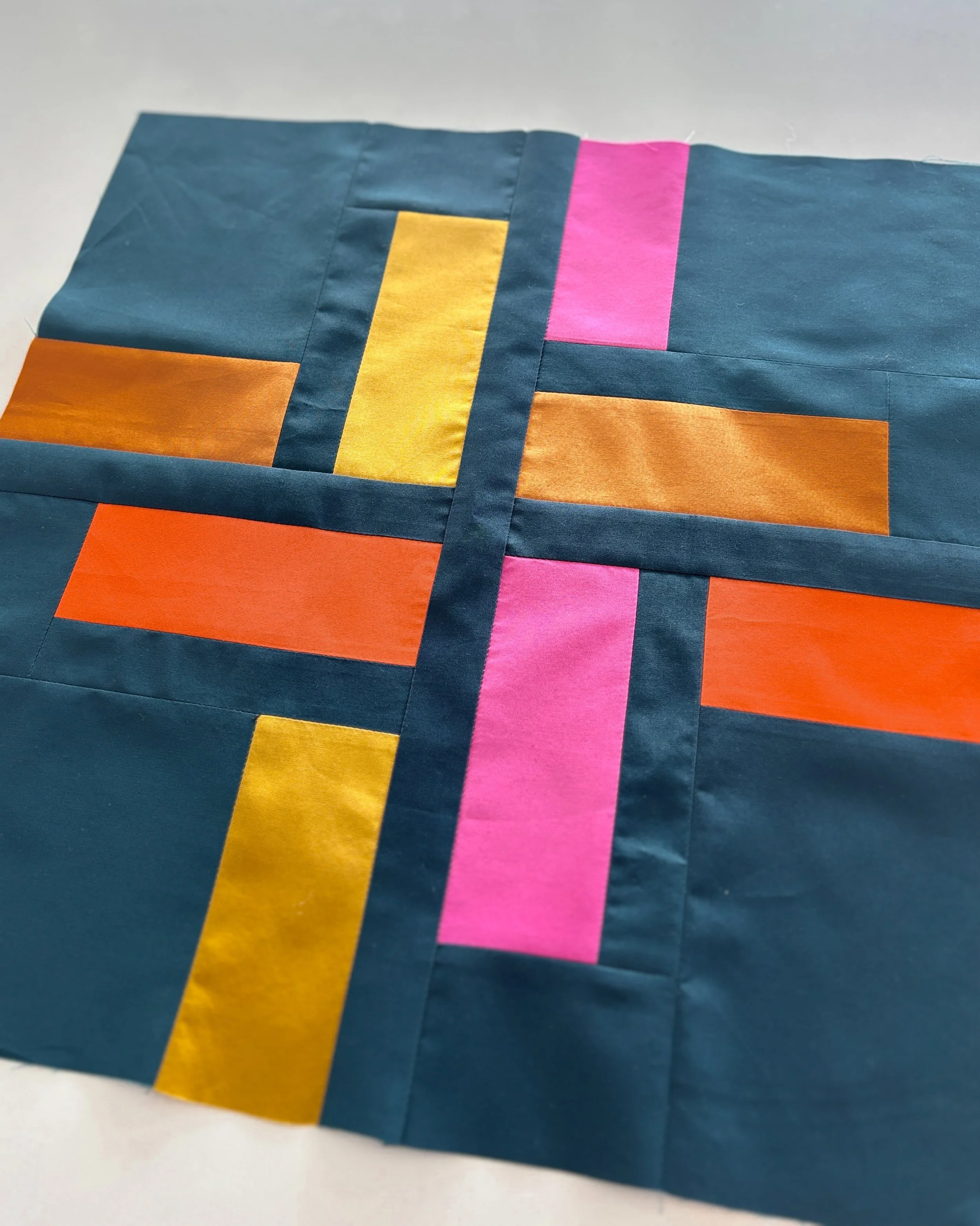 Each quadrant is pieced individually and the exact same way, and then joined together with narrow strips. While the construction itself is beginner-friendly, precision and organization are key to maintaining the effect!