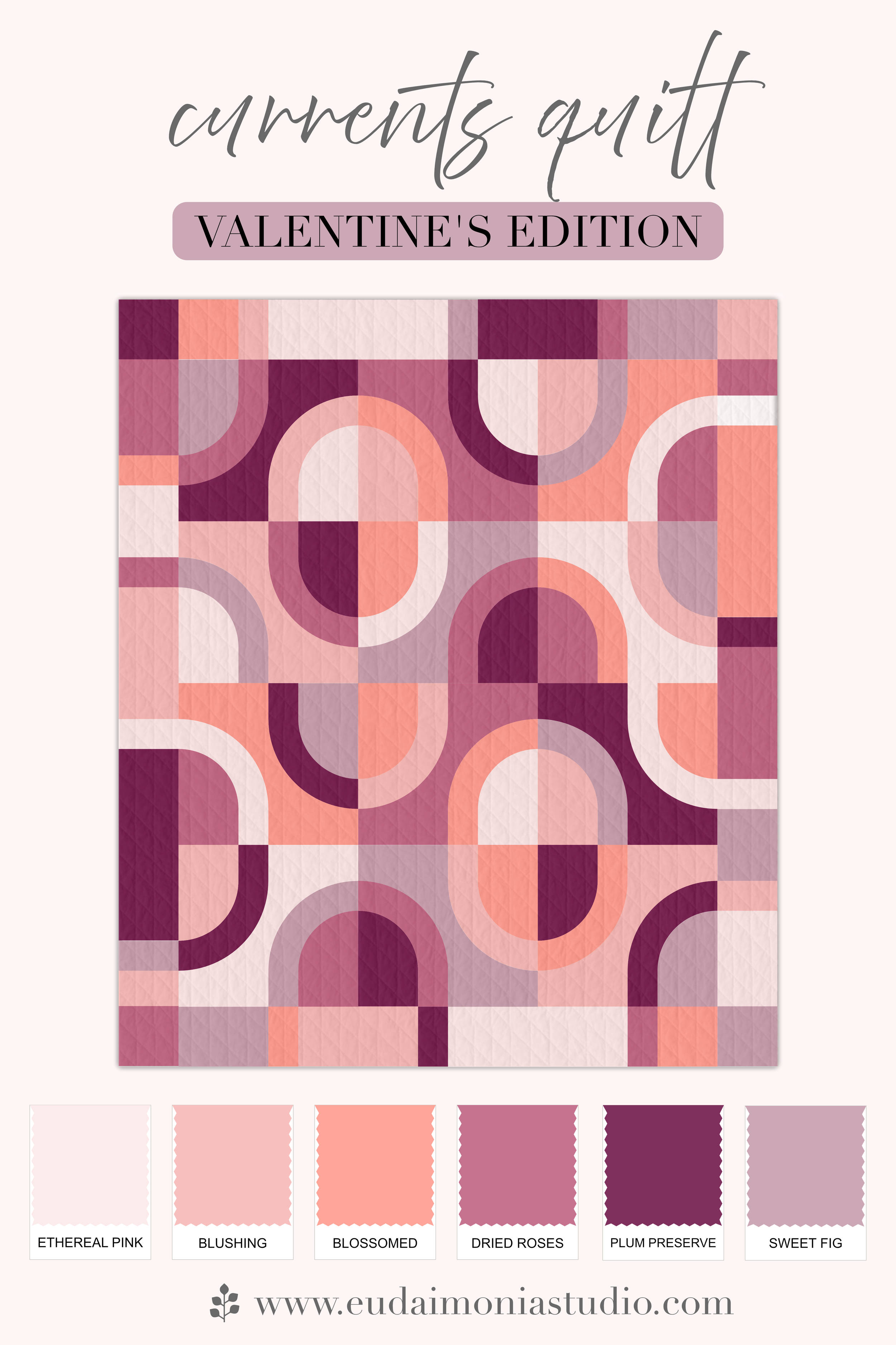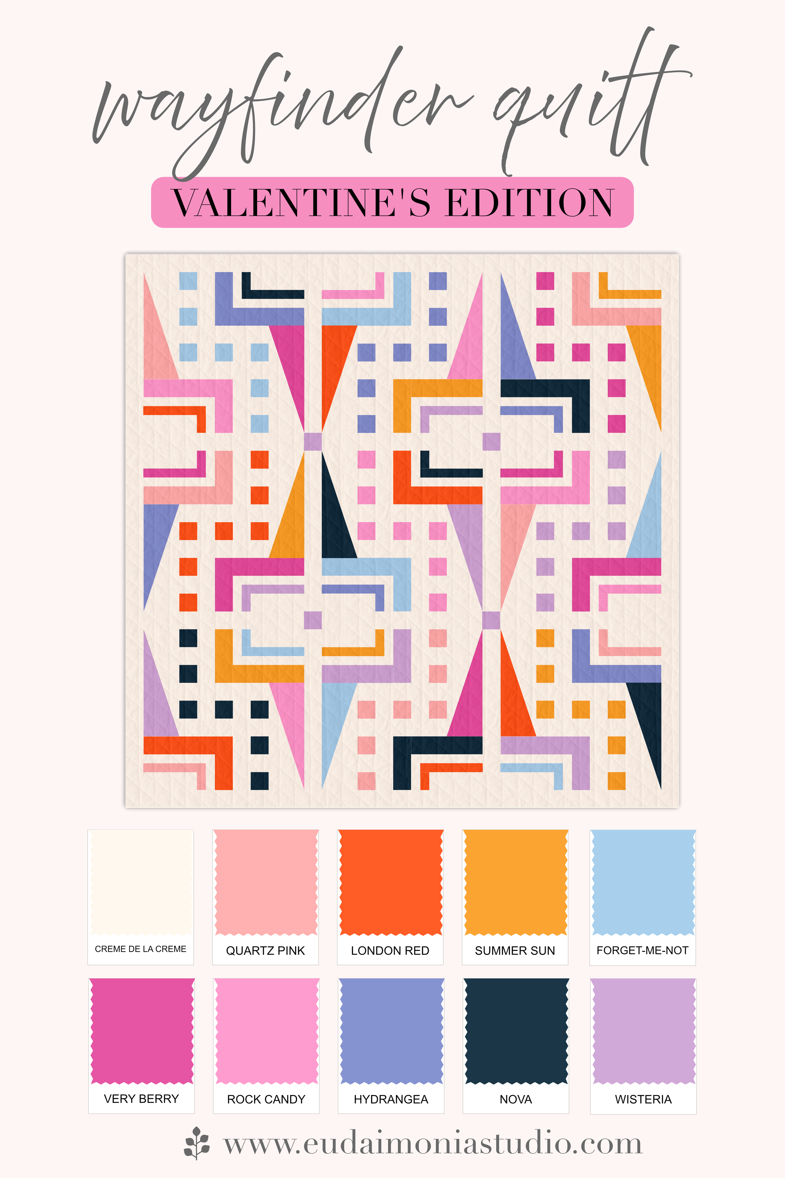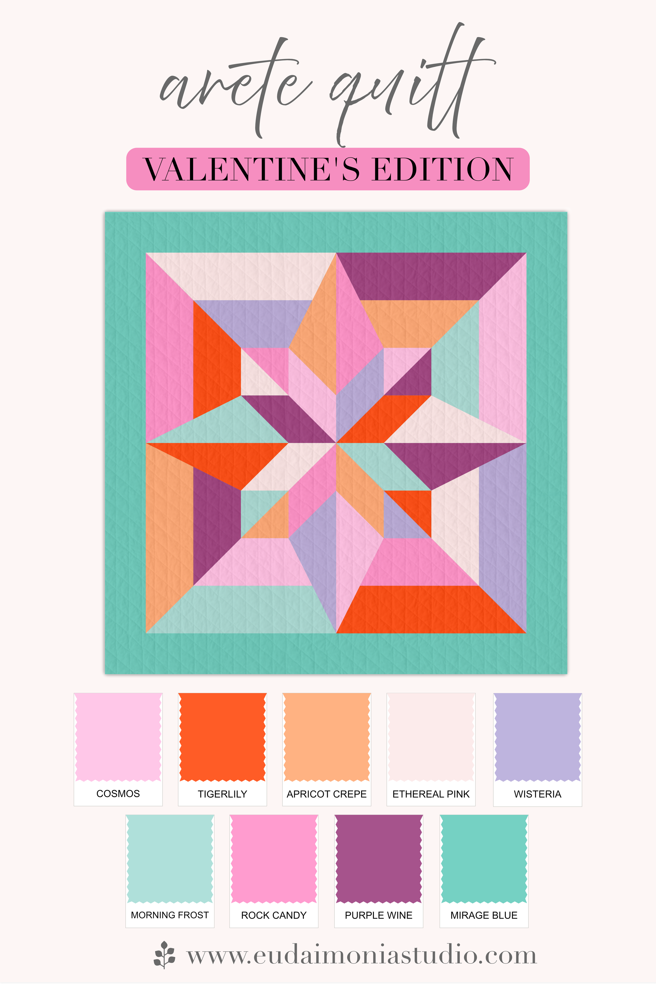 Below, you’ll find a selection of Valentine’s Day inspired color palettes paired with some of our favorite quilt patterns! For each quilt, we’ve used Art Gallery Fabrics Pure Solids, but these palettes are just as inspiring for any fabric line you love. Since Eudaimonia Studio patterns are available in PreQuilt, you can experiment freely and play with color to your heart’s content!