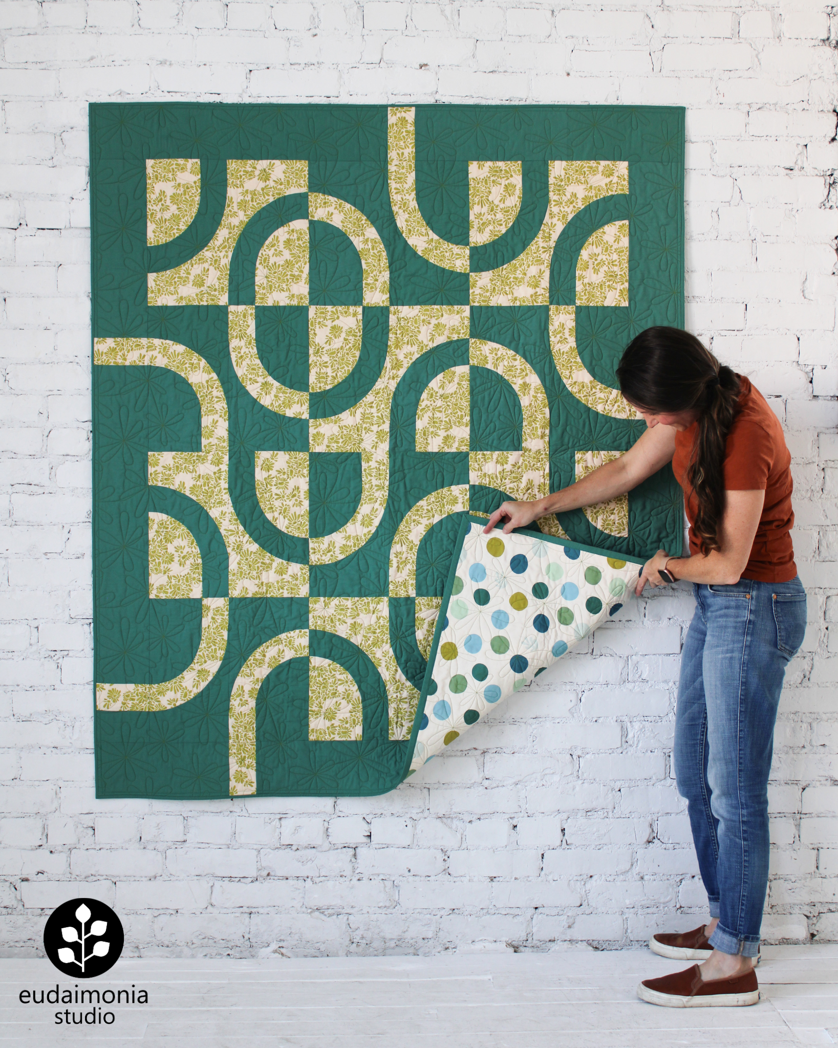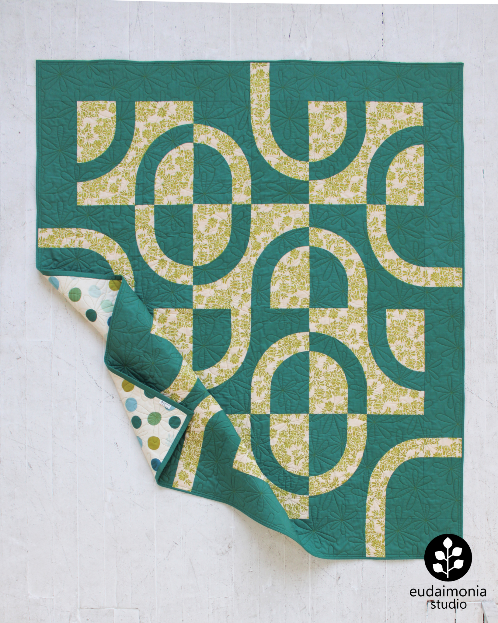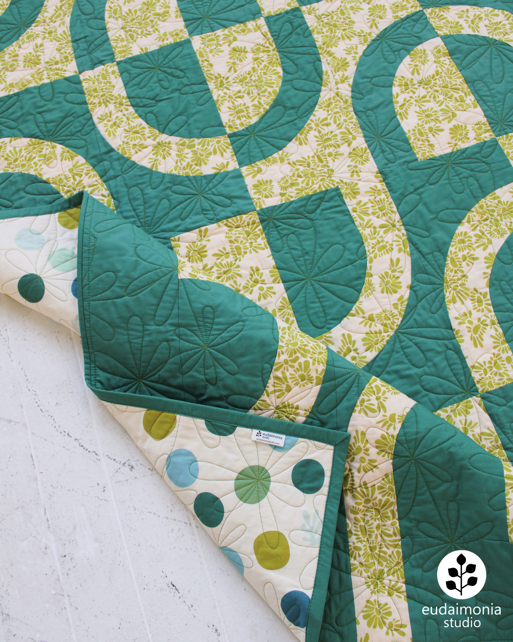This Green Meadow version of the Currents quilt uses a saturated green solid with a bright floral fabric for the “two-tone version with standard border”, for a look that’s both retro and fresh.
