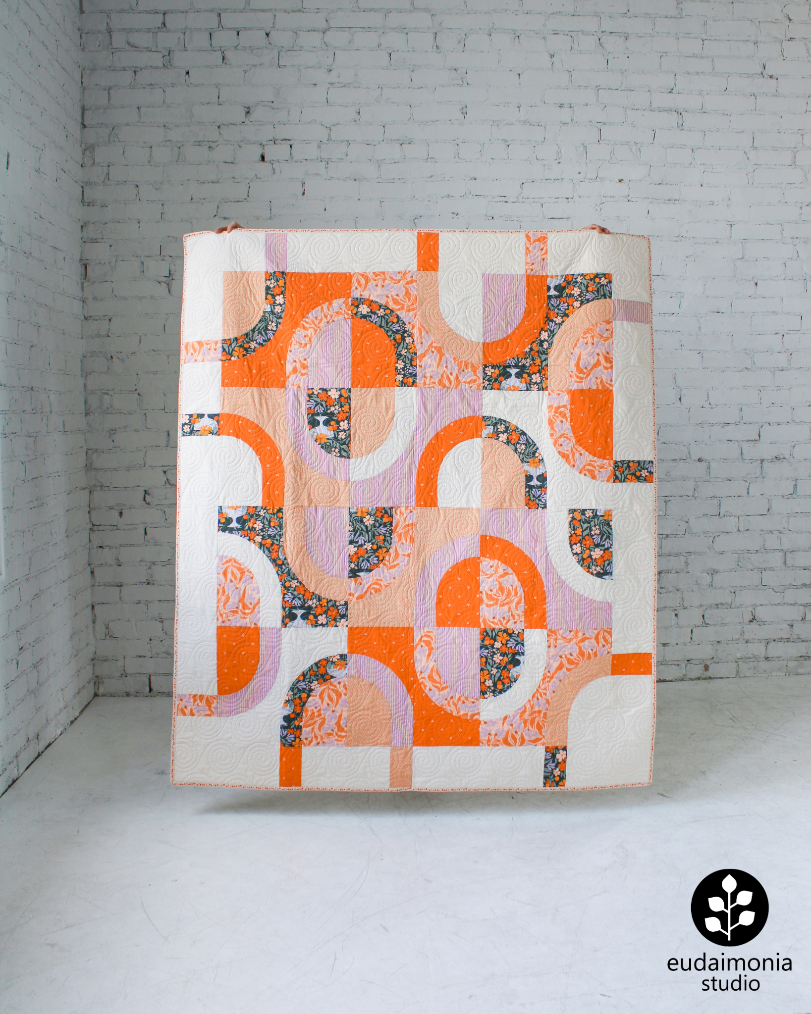 With its flowing, wave-like design, Currents is a joyful introduction to sewing curves. The large-sized forgiving blocks make it approachable for advanced beginners, while offering plenty of room for creative color play. Whether you’re going bold with the six-color version, or keeping it more minimalist with the two-tone version, this surprisingly quick pattern invites tons of variation!