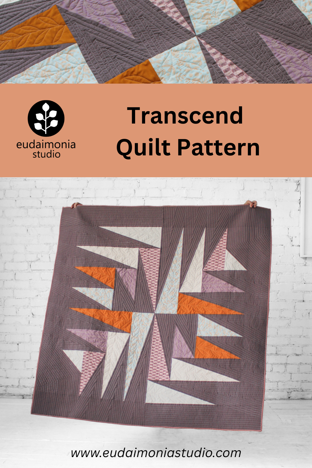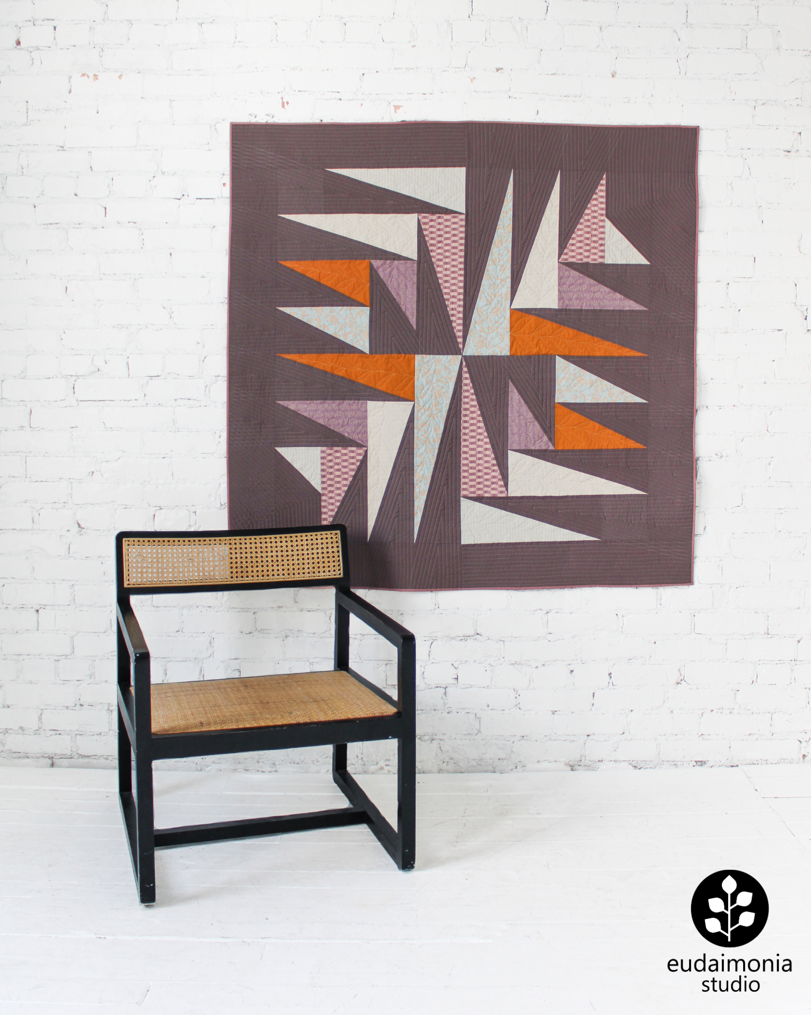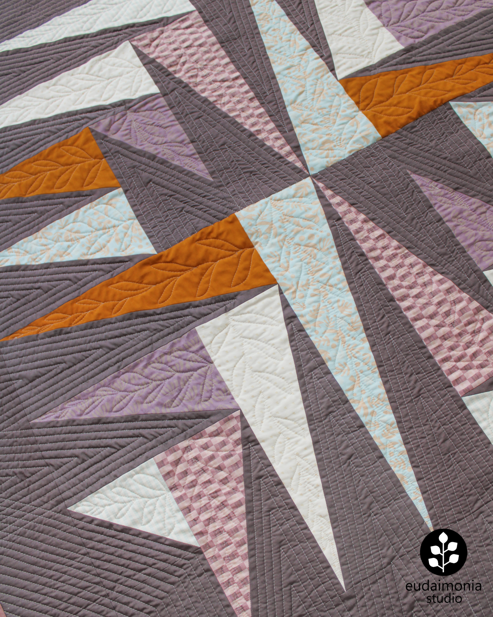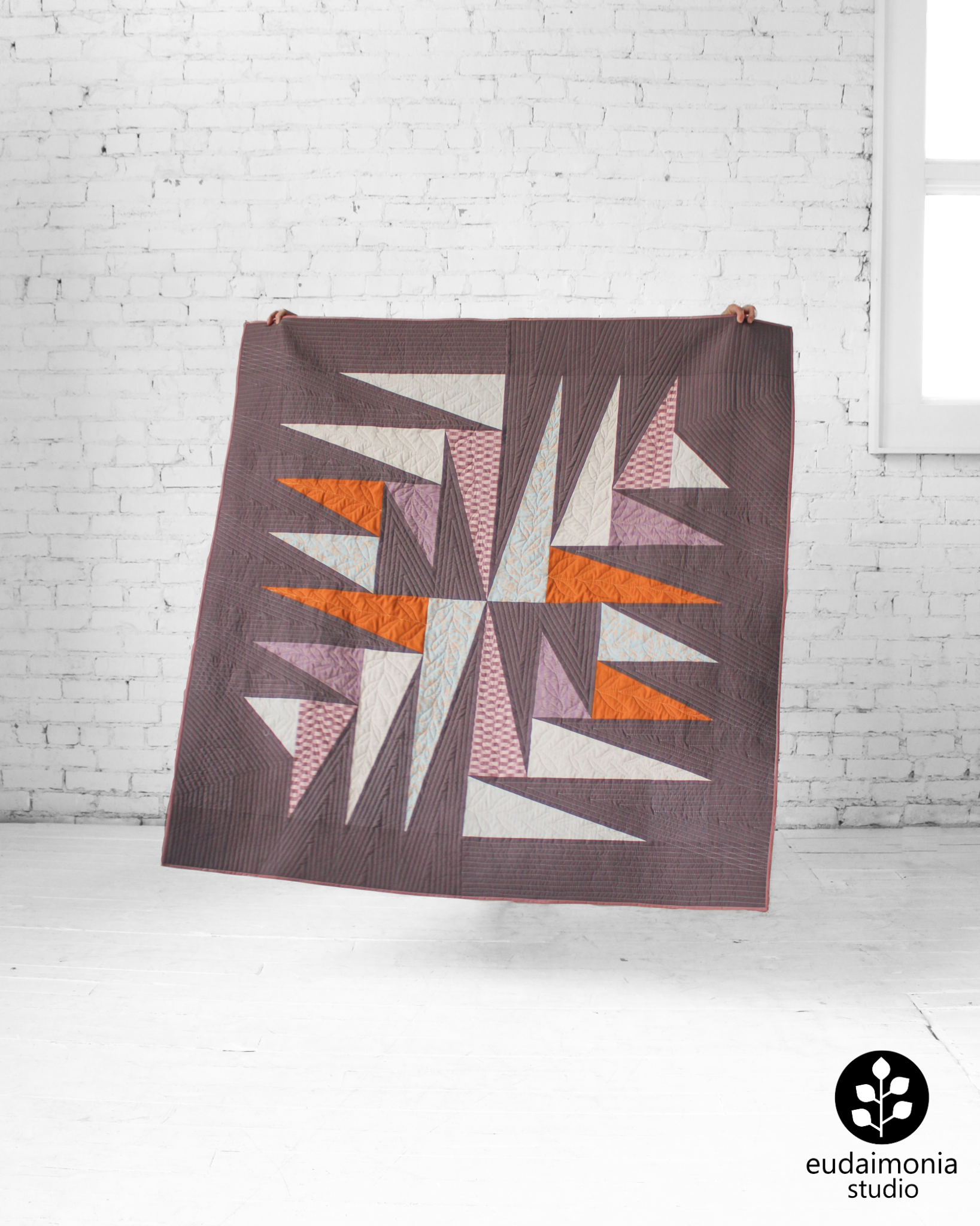 “Eudaimonia” is the Greek word for “human flourishing.” Eudaimonia Studio designs are inspired by the ancient question of what it means to live well. The Transcend quilt symbolizes many aspects of the early nineteenth century Transcendentalist movement, which emphasized - among other things - the value of individual intuition, the inherent creativity & goodness of people, and the divinity of nature. With its jagged shapes radiating outward, this design illustrates our ability to grow and transcend beyond our perceived earthly limits by looking inward and reconnecting with the natural world.