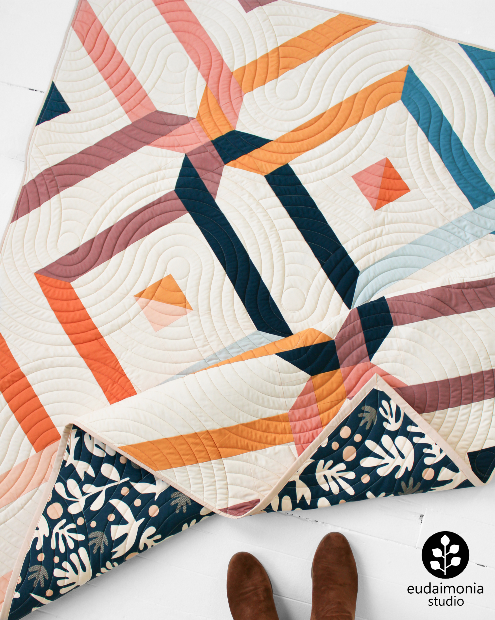 This was quilted by Wild Phil Quilting, using the Sunrise Skateland pantograph by Julie Hirt. I wanted to use double batting mostly because I was worried that the high-contrast backing would show through the light background of the top. However, I was not prepared to fall so in love with the delicious texture that extra loft gives this quilt!
