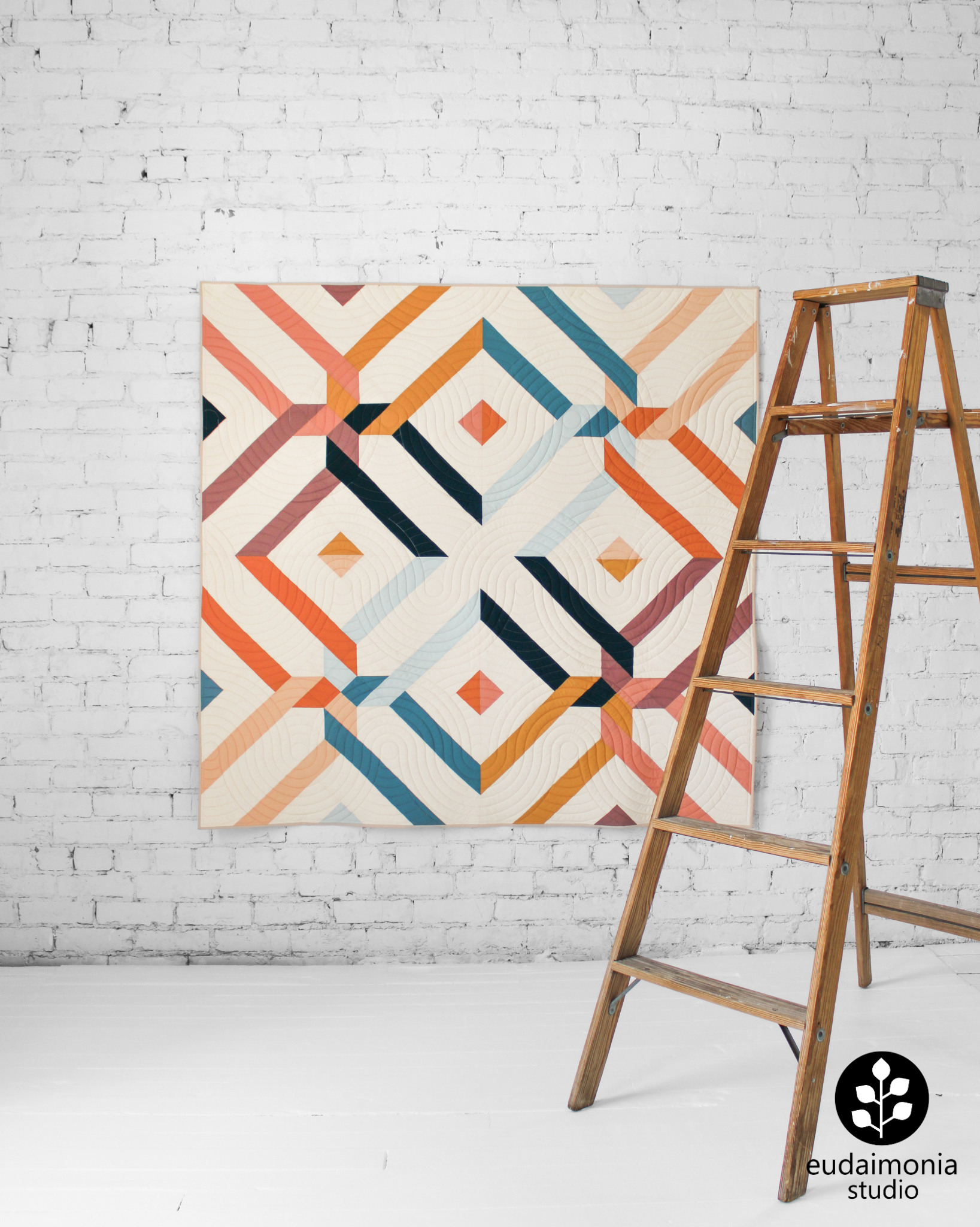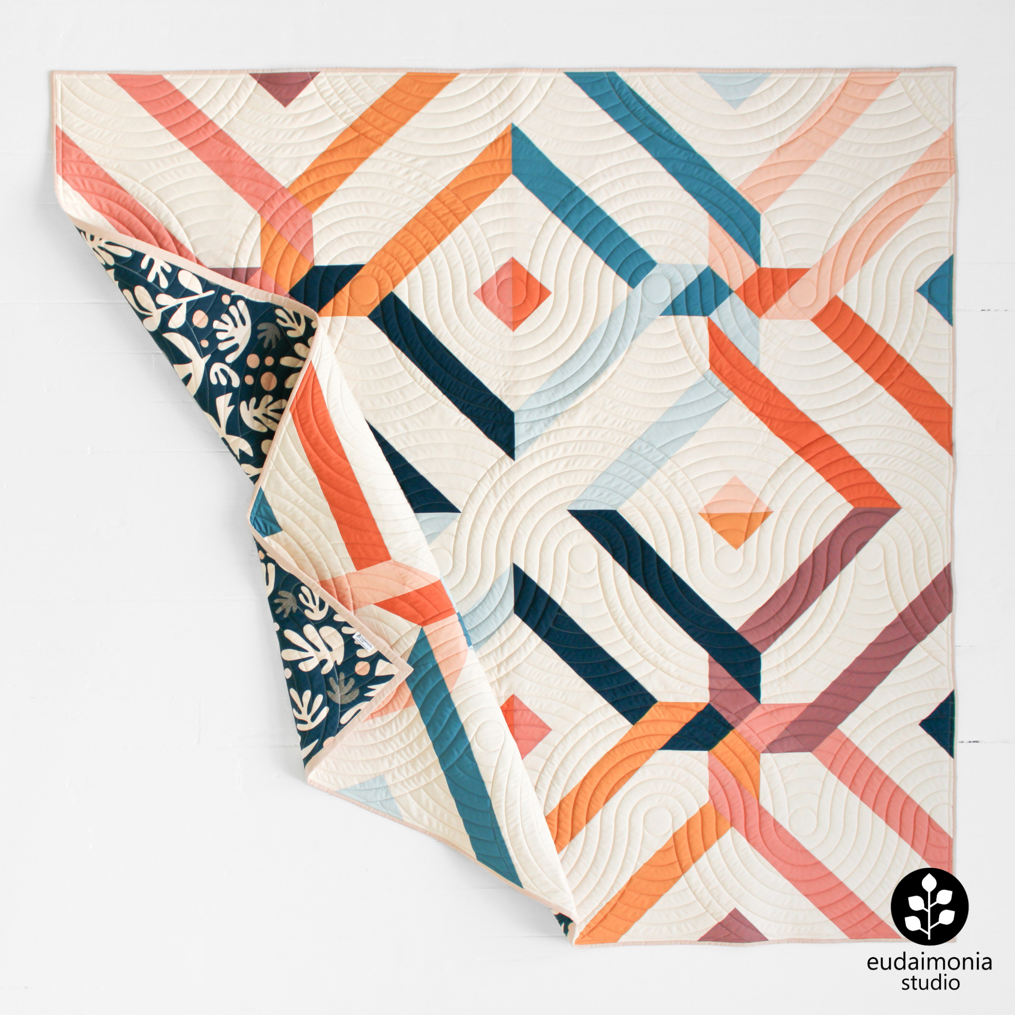 The pattern includes six sizes - Wall, Baby, Throw, Twin, Queen, and King - offering flexibility whether you’re sewing a quick weekend project or a full bed quilt. Though the finished design has a bold, complex look, construction is straightforward and efficient, making Villager a satisfying and surprisingly quick sew.