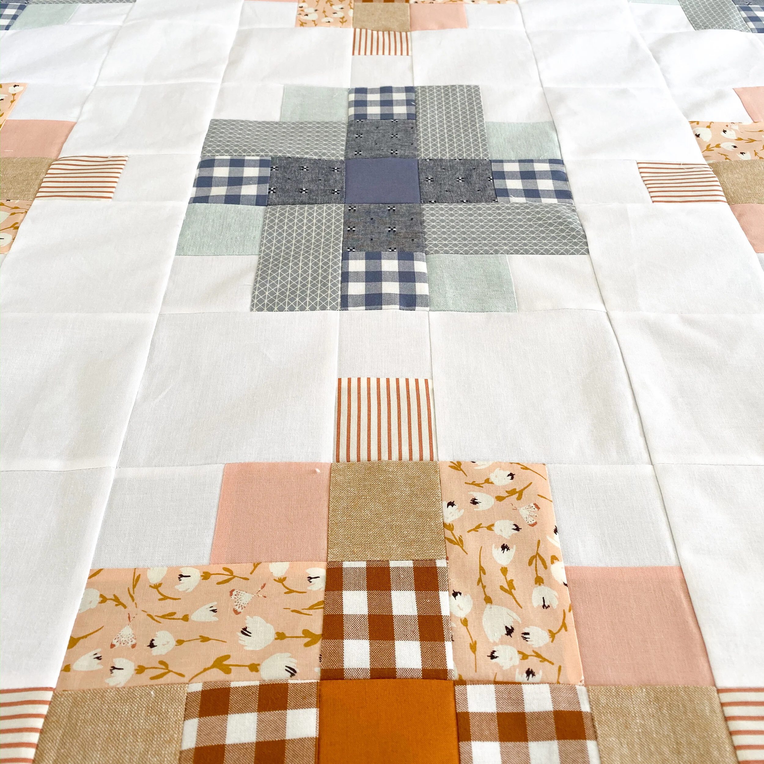 This quilt is machine quilted & bound for extra durability and is pre-washed. Made with both linen-cotton blend and cotton fabrics.