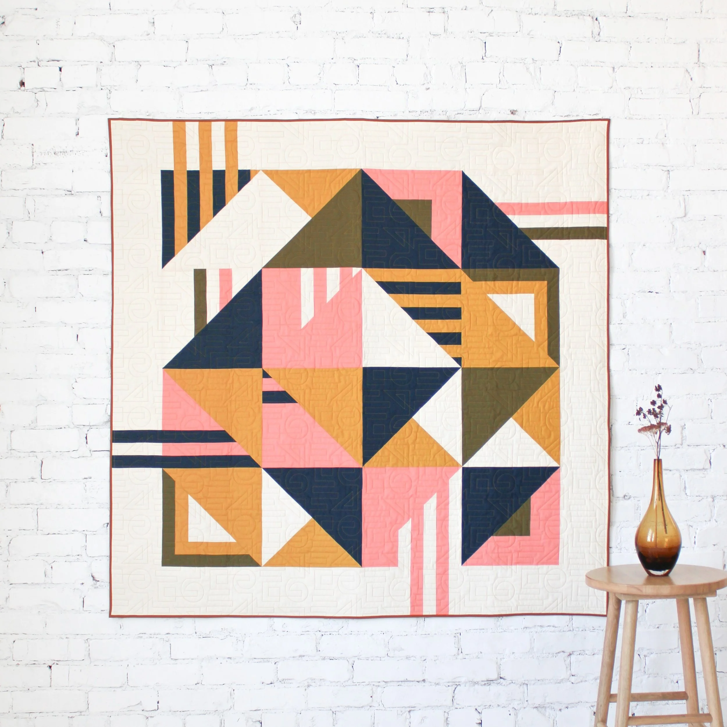 The Sincerely quilt is inspired by the idea that taking ourselves and life too seriously is counterproductive; rather, we should live sincerely. The bold & unique design reflects this concept with solid triangles representing genuineness paired with their untraditional HST counterparts that add levity and a playful aspect to the design.