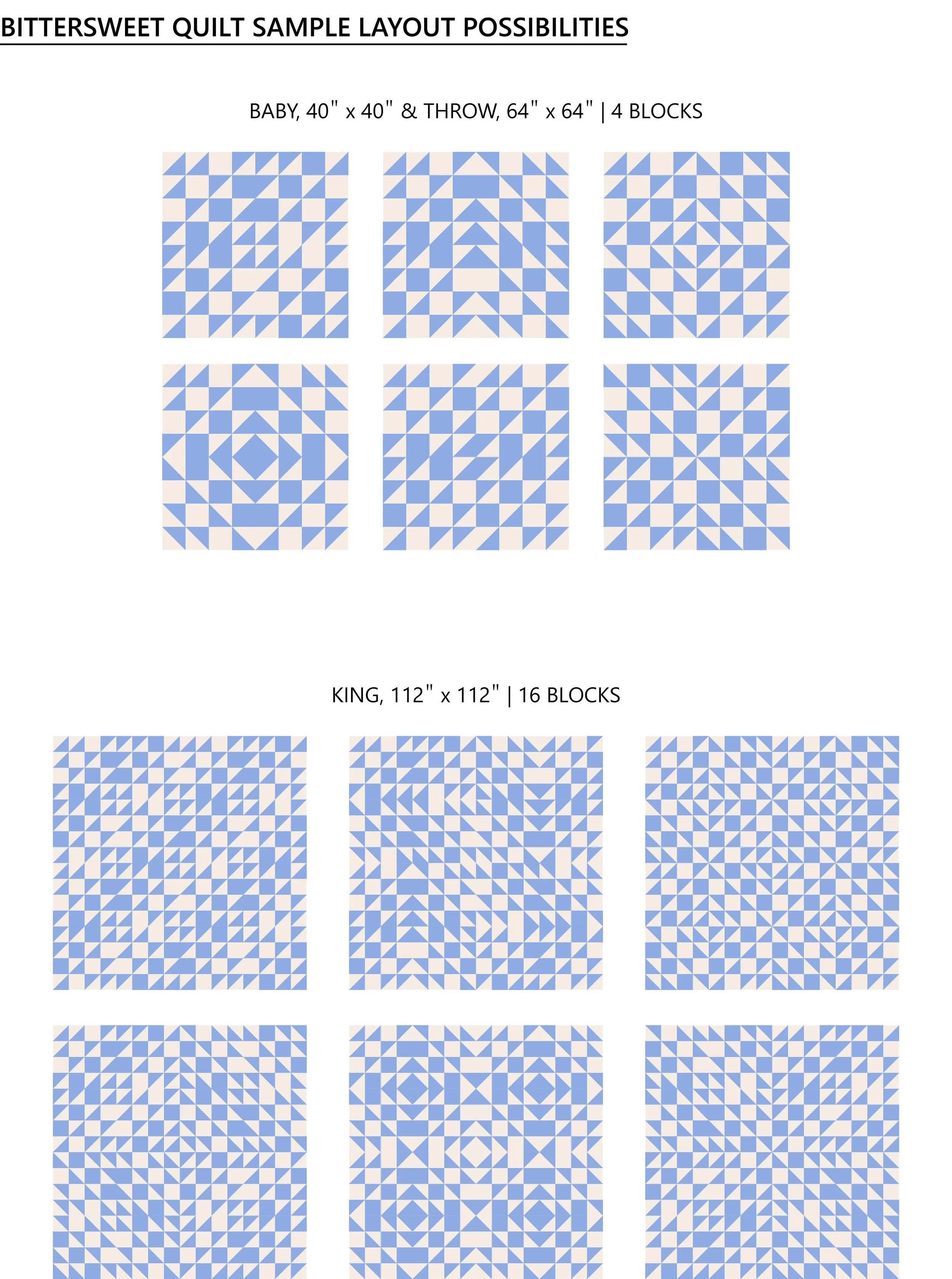 The Bittersweet quilt is inspired by the idea that all aspects of existence contain both yin (passive) and yang (active) energies, and that true balance comes from the dynamic interaction and harmony of these opposites, not the dominance of one over the other. The Bittersweet quilt block, with its diagonal symmetry of mirrored negatives, symbolizes the importance of embracing both the light and dark in life.